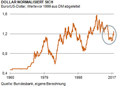Kapitalmarktrenditen aber gehen schon nach oben. Die Eurokrise, die die Gemeinschaftswährung lange Zeit belastet hat, nähert sich dem Ende. In den USA gibt es einen Präsidenten, der schwer zu kalkulieren ist. Niemand will hier gerne auf dem falschen Fuß erwischt werden. Die Zentralbanken der Welt sind dabei, ihre Währungsreserven breiter zu diversifizieren. Sie verkaufen Dollar. Das hängt natürlich auch damit zusammen, dass mit dem Chinesischen Renminbi ein neuer Stern am Währungshimmel aufgetaucht ist, der in den kommenden Jahren zunehmend eine Rolle spielen wird. Das wird auch zu Lasten des Dollars gehen.