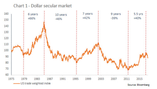 Wir gehen davon aus, dass dem US-Dollar eine säkulare Baissephase bevorsteht. In der Regel bewegt sich der Dollar in langfristigen Zyklen, wobei die durchschnittliche Haussephase 6 bis 7 Jahre und die durchschnittliche Baissephase 9-10 Jahre dauert (siehe Abbildung 1). Das könnte man als „Datenklauberei“ abtun, aber unsere pessimistische Einschätzung der Dollarentwicklung wird doch durch diverse Faktoren gestützt.