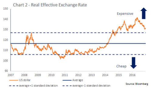Erstens ist der US-Dollar bezogen auf die meisten Kennzahlen trotz des Wertverlusts von 9% im DXY nach wie vor teuer. So ist der reale effektive Wechselkurs (also der inflationsbereinigte Wechselkurs) der US-Währung gemessen am handelsgewichteten US-Dollar-Index unverändert hoch (Abbildung 2).