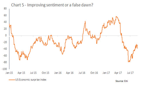 Mindestens eine von drei Voraussetzungen muss erfüllt sein, damit sich der US-Dollar stabilisiert oder der aktuelle Trend gar umkehrt. Erstens bedarf es einer günstigen Neubewertung am Devisenmarkt im weiteren Verlauf dieses Jahres sowie einer Zinserhöhung um 25 bis 50 Basispunkte im nächsten Jahr. Zweitens muss die US-Regierung wesentlich effizienter werden und endlich an einem Strang ziehen, damit die Wirtschaftspläne von US-Präsident Trump umgesetzt werden können. Hauptziel wären selbstverständlich Fortschritte bei der Steuerreform. Eine Einigung in diesem Bereich wäre ein Anreiz für multinationale US-Unternehmen, im Ausland erzielte Gewinne in die USA zurückzuholen. Das würde Dollar-Zuflüsse bescheren und die US-Währung möglicherweise stärken. Ein großer Teil dieser im Ausland gehorteten Gewinne lautet zwar bereits auf US-Dollar, doch einer Analyse zufolge ist dies bei einem ausreichend hohen Anteil nicht der Fall. Ihre Rückführung würde dem Dollar somit kräftig nach oben verhelfen. Und schließlich wäre eine nachhaltige Verbesserung der makroökonomischen Daten von Bedeutung. Der US-Economic Surprise Index hat sich bereits deutlich erholt (Abbildung 5). Maßgeblich dazu beigetragen haben jedoch vor allem nicht mehr im Index abgebildete Negativüberraschungen und weniger eine Flut an Positivmeldungen aus der Wirtschaft.