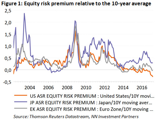 We recently strengthened our relative trade US versus Eurozone by downgrading the US to a medium underweight and upgrading the Eurozone to a medium overweight. The latest catalyst for a change was the failure of president Trump to repeal Obamacare, despite a republican majority in both the House and the Senate, which illustrates the gap between words, election promises, ideas and actual policy making. This has cast more doubts on the effectiveness of the current US administration with regard to his other plans. Indeed, up until today the market is – apart from good macro data – also underpinned by the scope of tax reform, more deregulation and infrastructure spending. We do not say that these elements will not happen, but the proof of the pudding is in the eating and thus far we did not see much convincing acts of policy on this front from this administration. Execution risk is for real and should in our view be accounted for by investors through a higher equity risk premium. However, reality is very different. The US equity risk premium (ERP) has fallen back to the lowest level since 2010, 30% lower than its 10-year average and only 60bps above the "Goldilocks-levels" of 2003-2007. This stands in contrast with the levels we observe elsewhere. Figure 1 illustrates the discount relative to the 10-year moving average in the US, Japan (far above average) and in the Eurozone (around average).