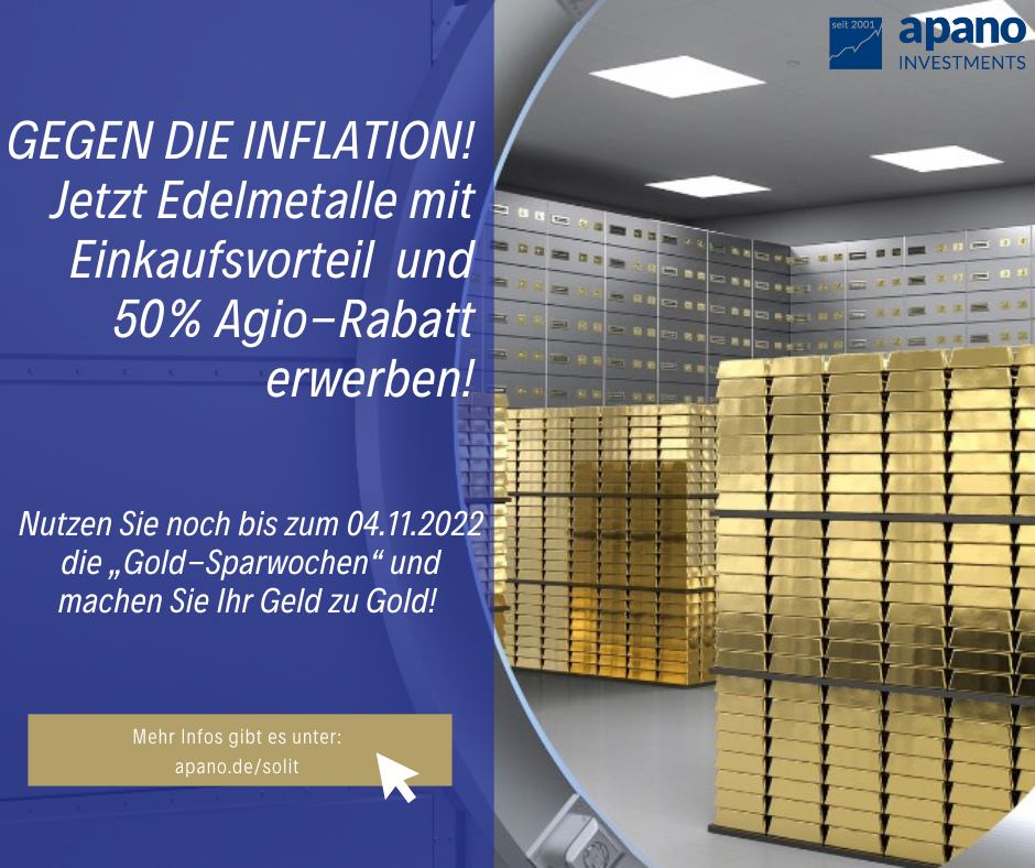 Wichtig: Nur bei der Eröffnung eines SOLIT Edelmetalldepot über apano erhalten Sie zusätzlich 50% Agio-Rabatt (2,5% statt 5,0%)!