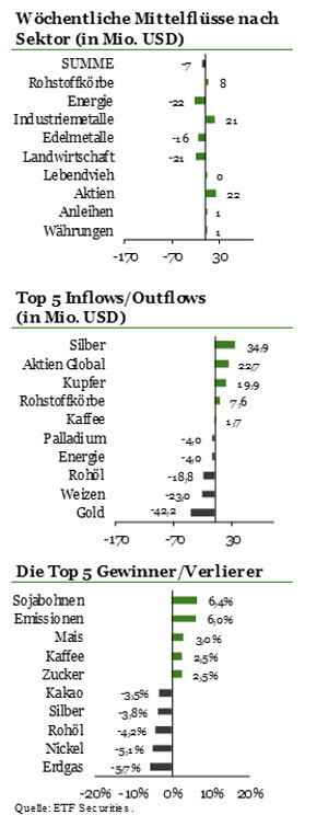 Anleger sehen bei Silber Aufholpotenzial zu Gold sehen. Wegen des ungewissen Ausblicks wurden erstmals seit Ende Mai Gelder aus Rohöl-ETPs abgezogen. Kupfer-ETPs führten mit den höchsten Zuflüssen seit 16 Wochen den Industriemetallbereich an. Gewinnmitnahmen ließen die Abflüsse aus Weizen auf ein Zweijahreshoch von 23 Mio. USD steigen.