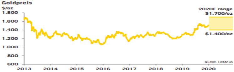 Das stetige Nachfragewachstum einerseits sowie die sinkende Angebotsmenge der großen Minenunternehmen andererseits würden zu einer angespannteren Marktlage führen. Dennoch werde ein geringer Marktüberschuss erwartet. Da der Preis sich bereits auf einem Rekordniveau befindet, erwartet Heraeus für 2020 eine enge Preisbandbreite zwischen 1.450 Dollar und 1.600 Dollar je Feinunze.