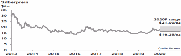 Das Silberangebot sollte 2020 leicht steigen. Es sei anzunehmen, dass auf Grund eines geringeren Silbergehalts im geförderten Erz und wegen Verzögerungen beim Ausbau bestehender Minen die primäre Silberförderung 2019 zurückgegangen sei. Diese Faktoren könnten auch in der ersten Jahreshälfte 2020 anhalten. Dennoch sollte sich die Situation verbessern, zudem werde wegen eines weltweiten Anstiegs der Fördermengen von Zink-, Blei- und Kupferminen die Silberproduktion als Beiprodukt zunehmen.