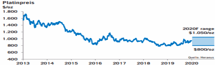 Der Marktüberschuss (exklusive Investment) betrage über eine Million Unzen (31,1 Tonnen). Die Investmentnachfrage nach Platin habe 2019 deutlich über eine Million Unzen (31,1 Tonnen) gelegen: Die Bestände der Platin-ETFs seien um 960.000 Unzen (29,9 Tonnen) gewachsen, die Käufe von Münzen und Barren hätten sich auf mehr als 200.000 Unzen (6,2 Tonnen erhöht. Es sei zwar unwahrscheinlich, dass sich ein derartiger Bestandszuwachs durch ETF-Käufe wiederhole. Da Platin weiterhin einen enormen Abschlag zu Gold und Palladium aufweise, könnte das Interesse von Investoren weiter bestehen bleiben. Der fundamentale Ausblick für Platin bleibe schwach. Deshalb erwartet Heraeus, dass der Preis in einer Spanne zwischen 800 Dollar und 1.050 Dollar je Feinunze handeln wird und maßgeblich vom Interesse der Anleger profitiert.