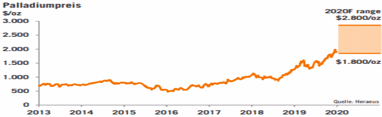 Der Palladiumpreis sei 2019 um 50 Prozent gestiegen, habe sich innerhalb von nur zwei Jahren verdoppelt und notiere jetzt mehr als doppelt so hoch wie auf seinem 2001 erreichten vormaligen Rekordstand. Zu beachten sei jedoch, dass auf derart ausgeprägte Preisanstiege bei einer Änderung des Marktumfeldes ebenso hohe Preisrückgänge folgen könnten. Das größte Abwärtsrisiko für Palladium wäre eine Verschlechterung des gesamtwirtschaftlichen Ausblicks, der zu einem Rückgang des PKW-Absatzes führen würde.