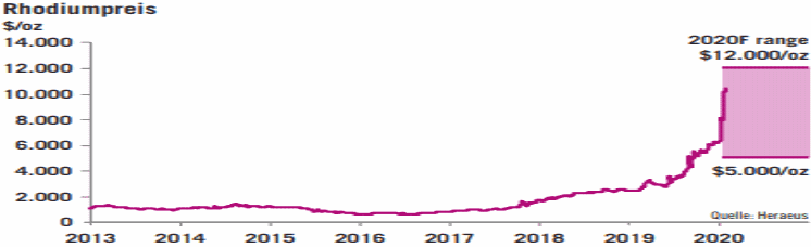 Der zunehmende Rhodiumbedarf der Autoindustrie habe im zweiten Jahr in Folge zu einem Marktdefizit geführt. Rhodium habe 2019 mit einem Preisanstieg um 3.810 Dollar bzw. 151 Prozent die mit Abstand beste Preisentwicklung unter den PGM vorweisen können. Die Nachfragestruktur ähnele derjenigen von Palladium, folglich stelle ein schrumpfender Automobilabsatz die größte Gefahr für den Rhodiumpreis dar - jede Störung der Förderung würde entsprechend den Aufwärtsdruck auf den Preis erhöhen. Auf dem Markt herrsche Knappheit und die Preisvolatilität könnte weiter zunehmen, sodass für Rhodium in diesem Jahr aus der Sicht von Heraeus eine Handelsspanne zwischen 5.000 Dollar und 12.000 Dollar je Feinunze zu erwarten ist.