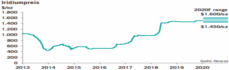Die Förderung von Iridium, die 2019 einen Höchststand erreichte, werde in diesem Jahr sinken. Die südafrikanische Iridiumförderung, die einen Anteil von über 80 Prozent am globalen Primärangebot habe, werde voraussichtlich um etwa sieben Prozent zurückgehen. Da die Förderung im vergangenen Jahr ein Rekordniveau erreicht habe, stelle dies einen Rückgang auf ein eher normales Niveau dar. Die Wiederinbetriebnahme von Minen wie der Eland-Mine und die verzögerte Stilllegung von Schächten werde auf das gesamte Marktangebot lediglich einen marginalen Effekt ausüben.