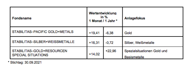 Minensektor ausgerichteten Stabilitas-Edelmetallfonds, die unter der