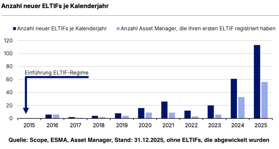 Tatsächlich zeigen die Zahlen, dass der ELTIF-Markt gerade in eine neue Phase eintritt. Für Finanzberater, Vermögensverwalter und andere Intermediäre entsteht damit ein neues Spielfeld – mit Chancen, aber auch mit einigen Stolperfallen. Ein Markt erwacht Lange dümpelte der ELTIF-Markt vor sich hin. Erst die Reform des Regelwerks – häufig als „ELTIF 2.0“ bezeichnet – hat den Rahmen deutlich attraktiver gemacht. Seither wächst der Markt mit erstaunlichem Tempo. Ende 2025 lag das Marktvolumen europaweit bei etwa 34 Milliarden Euro. Gegenüber dem Vorjahr entspricht das einem Zuwachs von rund 55 Prozent. Auch auf der Produktseite ist Bewegung zu sehen. Allein im vergangenen Jahr kamen laut Scope-Studie 113 neue ELTIFs hinzu – so viele wie noch nie. Gleichzeitig wagten 56 Asset Manager erstmals den Schritt in dieses Segment. Die Scope-Analysten sprechen deshalb von einem Rekordjahr für die Anlageklasse.