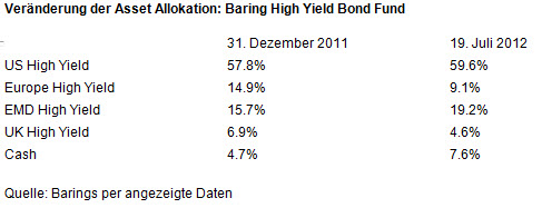 Der Fonds hat derzeit sein geringstes Exposure in den UK mit 4,6%, während Europäische High Yields bei 9,1% liegen, nachdem sie im Dezember 2011 noch bei 14,9% lagen. Per Mitte Juli waren 59,6% des Fonds in US High Yield Anleihen und 19,2% in Emerging Markets High Yield Debt investiert. Der Kassenbestand wird zum Volatilitätsmanagement genutzt und erhöhte sich von 4,7% im Dezember 2011 auf 7,6% im Juli 2012.