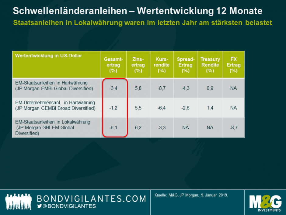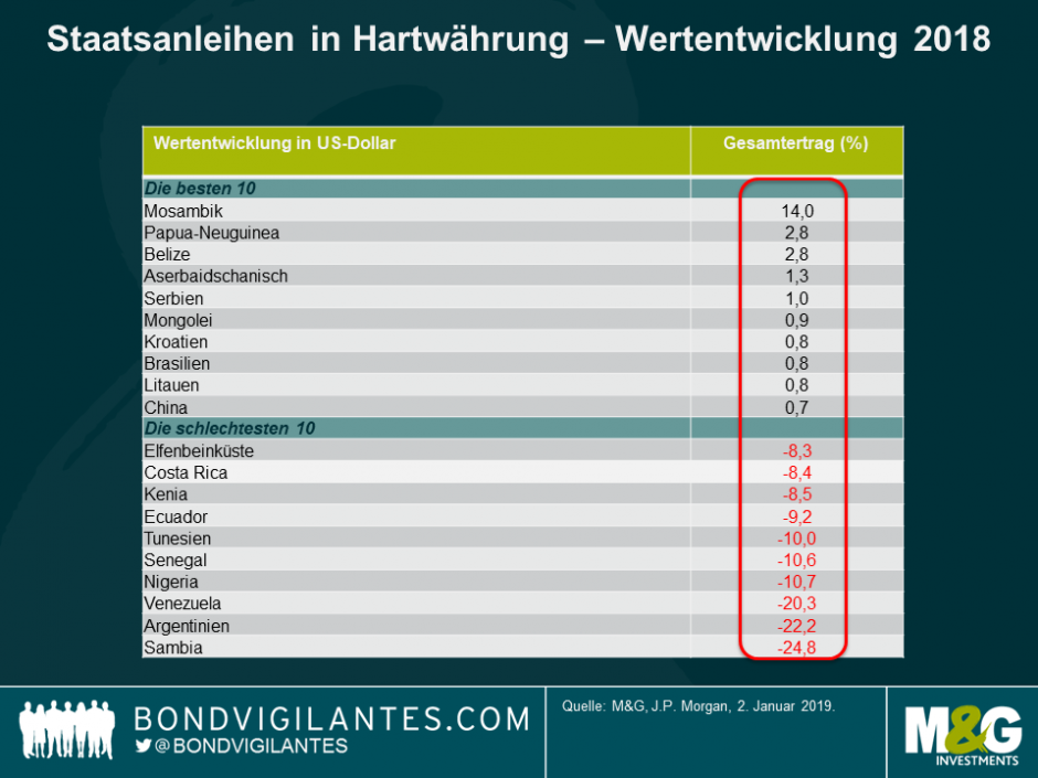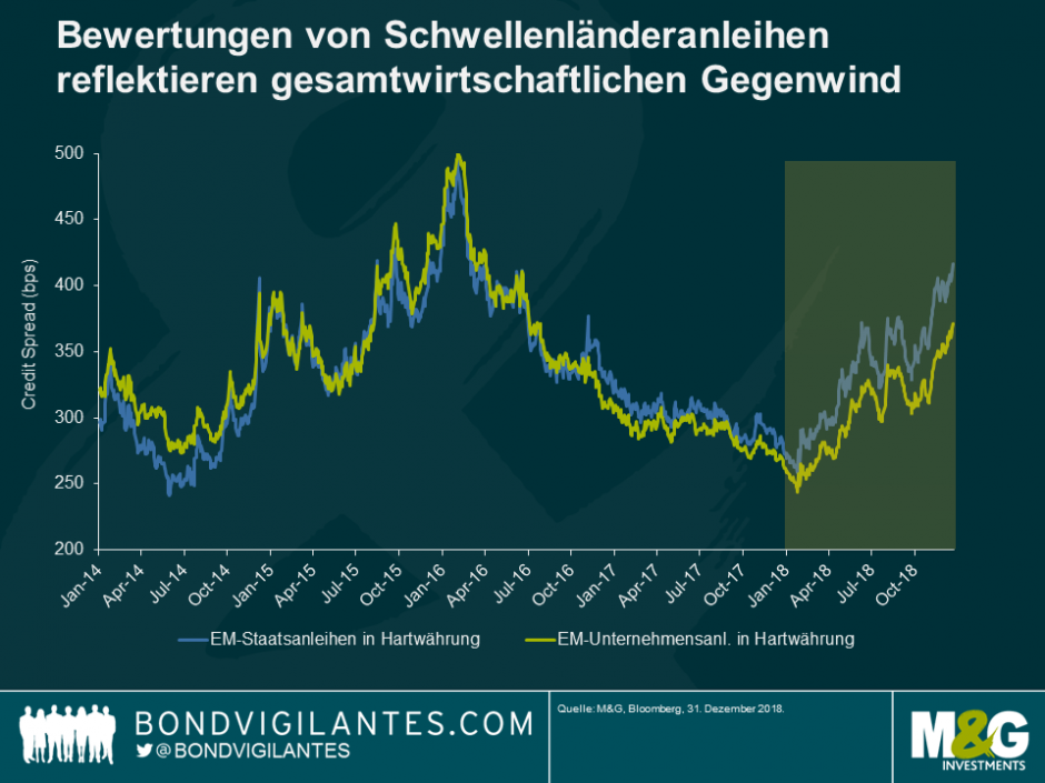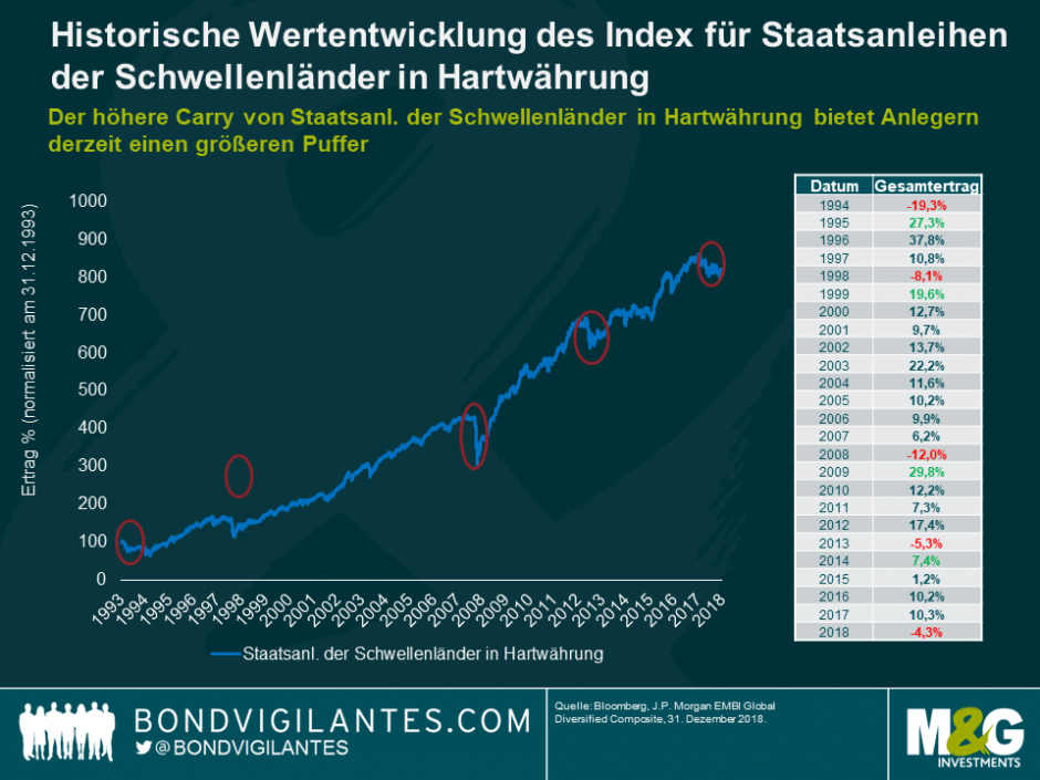 Während also die globalen makroökonomischen Risiken im Jahr 2019 voraussichtlich nicht nachlassen werden, befindet sich die Rendite von Schwellenländeranleihen (rund 7% bei Staatsanleihen in US-Dollar) auf dem höchsten Stand seit der globalen Finanzkrise 2007-2008, was die Aussichten auf verbesserte. Renditen im Vergleich zum Vorjahr erhöht. In der Tat haben Hartwährungsanleihen seit 1994 nie zwei aufeinander folgende Jahre mit negativen Renditen verzeichnet.