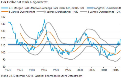Der Dollar könnte zwar noch weiter aufwerten, aber wohl nicht so stark wie in den Jahren 2014/2015. Die Abbildung unten zeigt, dass der Dollar in den letzten Jahren erheblich aufgewertet hat und im Vergangenheitsvergleich nicht mehr billig ist. Auch nach unserem Modell für den langfristigen fairen Wechselkurs sind Emerging-Market-Währungen insgesamt unterbewertet. Wir bleiben zwar vorsichtig, halten aber immer mehr Währungen für attraktiv bewertet. Aus unserer Sicht könnte die Wechselkursentwicklung sogar günstig für Emerging-Market-Papiere sein.