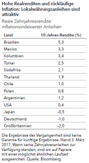 Dennoch bieten Emerging-Market-Anleihen einen ordentlichen Renditepuffer gegenüber Industrieländeranleihen. Die realen (also inflationsbereinigten) Renditen sind nach der US-Wahl zwar gestiegen, aber ein großer Teil des Puffers entfällt auf steigende Inflationserwartungen. Wie die Tabelle links zeigt, lag die Rendite von inflationsgeschützten US-Staatsanleihen Ende Februar unter 1%. In Japan, Großbritannien und Deutschland bleiben die Realrenditen aufgrund der außergewöhnlich expansiven Geldpolitik und der steigenden Inflation sogar unter null. In diesem Umfeld bieten Lokalwährungsanleihennoch immer einen erheblichen Renditevorsprung gegenüber Industrieländerpapieren.