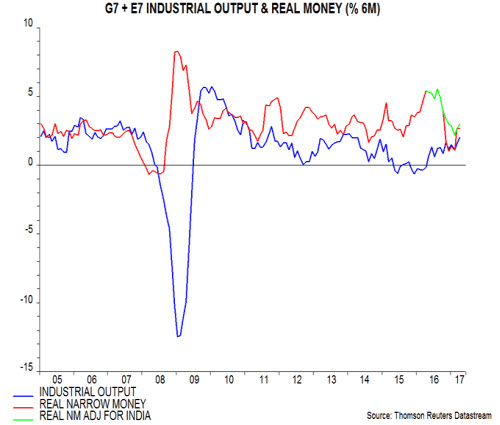 Based on partial data, six-month growth of global industrial output is likely to have risen further in April to its highest level since 2014 (“global” = G7 plus “E7” large emerging economies). Growth may decline in May, reflecting an unfavourable base effect from a large monthly output rise in November 2016. An April peak in six-month growth would be consistent with global real narrow money trends: six-month real money expansion peaked in August 2016 and has led output growth turning points by an average of nine months historically – see first chart.