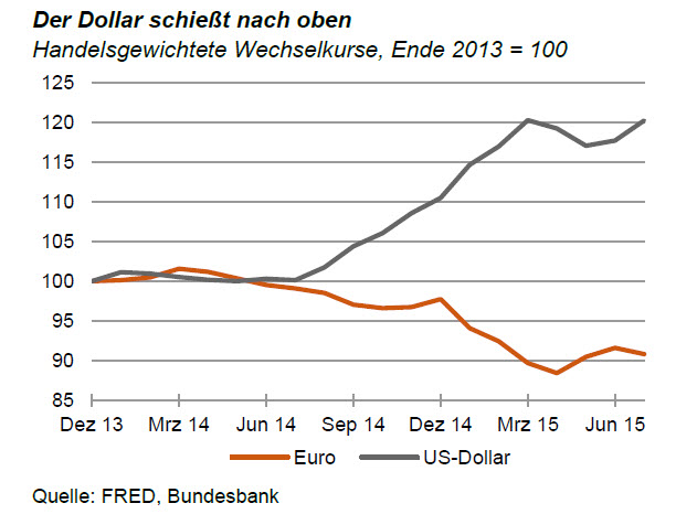 Verlierer sind letztlich auch die USA selbst. Sie schießen sich durch die Wechselkurswirkungen der geplanten Zinserhöhung selbst ins Knie. Addiert man die handelsgewichtete Aufwertung des Dollars zu der handelsgewichteten Abwertung des Euros in den letzten zwölf Monaten, so ergibt sich eine Verschlechterung der Wettbewerbssituation der USA um über 30 %. So etwas muss von den US-Unternehmen erst einmal verkraftet werden. Es erklärt, dass die amerikanische Wirtschaft in diesem Aufschwung wesentlich schlechter vorankommt als erwartet.