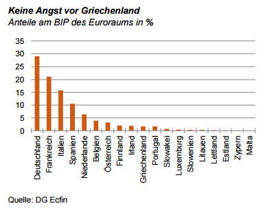 Eine Katastrophe und Grund für einen Crash ist das aber nicht. Für die Realwirtschaft spielt Griechenland nur eine geringe Rolle. Es macht weniger als 2 % der gesamten Wirtschaftsleistung des Euroraums aus (siehe Grafik). In absoluten Größen ist sein Bruttoinlandspro¬dukt nur wenig größer als das Oberbayerns und Niederbayerns zusammengenommen. Für die Finanzwirtschaft ist die Bedeutung etwas größer. Es gibt eine Reihe von US-Investoren (auch Hedge-Fonds), die in der Hoffnung auf positive Ergebnisse der Reformpolitik in Europa investiert haben. Wenn sie enttäuscht werden, können sie wieder gehen. Es gibt auch viele Fluchtgelder aus Griechenland, die zurückgezogen werden könnten. All das könnte an manchen Märkten Verwerfungen hervorrufen (nicht zuletzt an einigen Immobilienmärkten). Was die Fluchtgelder betrifft, so glaube ich freilich nicht, dass sie so schnell wieder nach Athen zurückkehren. Ihre Eigentümer werden bei einem Grexit eher von der Aufwertung des Resteuros profitieren wollen.