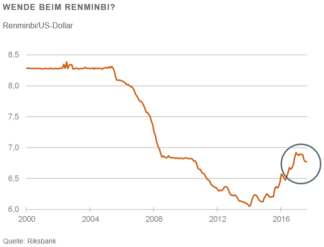 Die chinesische Währung beginnt, sich gegenüber dem US-Dollar wieder zu festigen (noch nicht gegenüber dem Euro). Damit geht die drei Jahre dauernde Schwäche der Währung zu Ende. Für Auslandsinvestoren in China ist das eine gute Nachricht, da sie von Aufwertungsgewinnen profitieren können. Aber auch für das Land selbst ist es nicht schlecht. Seine Exportindustrie braucht nicht die Unterstützung durch eine Abwertung. Die Handelsbilanz weist ohnehin einen großen Überschuss auf. Eine starke Währung unterstützt andererseits die politischen Bemühungen Pekings, den Renminbi im Kreis der Topwährungen der Welt zu etablieren. Vor einem Jahr war der Renminbi in den exklusiven Währungskorb der Sonderziehungsrechte des Internationalen Währungsfonds aufgenommen worden.