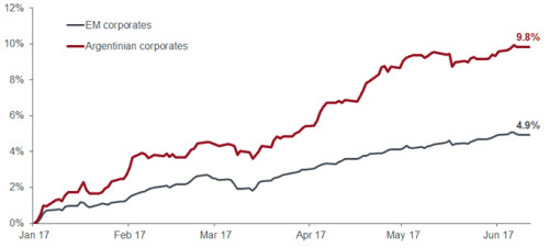 Quelle: Bloomberg, EM-Unternehmensanleihen = JPMorgan CEMBI Broad Diversified Index, argentinische Unternehmensanleihen: argentinische Komponente des JPMorgan CEMBI Broad Diversified Index, Stand:12. Juni 2017. Wertentwicklungen in der Vergangenheit sind kein Indikator für die zukünftige Performance.