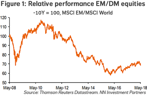 This introduction about inflation and EMD helps explain the recent moves in EM equity markets. Since their 22 March peak, EM equities underperformed developed markets by 6 percentage points. This is substantial, but not enough to break the positive trend that started more than two years ago (see Figure 1).
