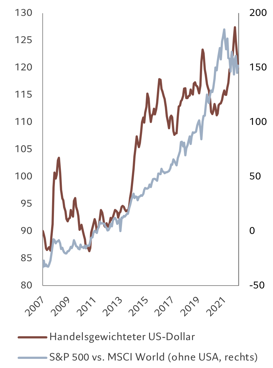 Da wäre zunächst der Richtungswechsel beim US-Dollar. Es mehreren sich die Anzeichen, dass der Höhenflug des Greenback der letzten zehn Jahre langsam ein Ende findet. Der Ausnahmestatus der USA wird zunehmend infrage gestellt: Der Risikoappetit der Investoren kehrt nach der Covid-Pandemie, dem ersten Schock, den der Ukrainekrieg ausgelöst hat, und den Jahren der Desinflation und der Verzerrung durch die Geldpolitik nach und nach zurück.