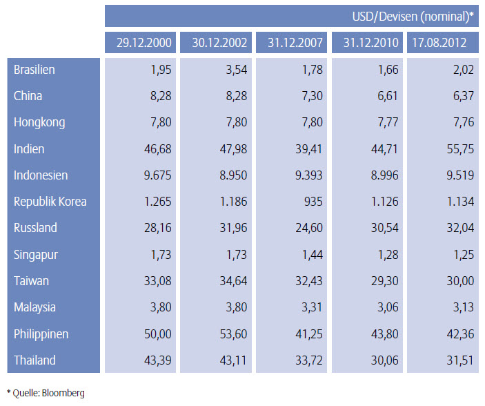 Der chinesische Renminbi (RMB) notierte zu Beginn des Jahrtausends bei 8,28 gegenüber dem US-Dollar (USD). Ende August 2012 lag er dagegen bei rund 6,35. Bei anderen asiatischen Währungen ist eine ähnliche Entwicklung zu verzeichnen. Das geht aus der Studie „Langfristiges Szenario für Schwellenländerwährungen“ hervor, die Stefan Hofrichter, Leiter der Abteilung Volkswirtschaft und Strategie bei Allianz Global Investors kürzlich veröffentlichte. „Der Singapur-Dollar hat von einem Stand von rund 1,85 vor zehn Jahren bis August 2012 auf 1,25 aufgewertet, der koreanische Won von etwa 1.300 auf etwa 1.100, der thailändische Baht, der während der Asien-Krise 1997 deutlich abwertete, von etwa 45 auf rund 31“, beschreibt Hofrichter nur einige Beispiele. Die Aufwertung sei nicht nur auf Schwellenländer in Asien beschränkt: Der brasilianische Real notiere per August 2012 bei zwei. Zehn Jahre zuvor habe er noch bei 3,7 gelegen. Auch der chilenische und kolumbianische Peso hätten im vergangenen Jahrzehnt erheblich aufgewertet.
