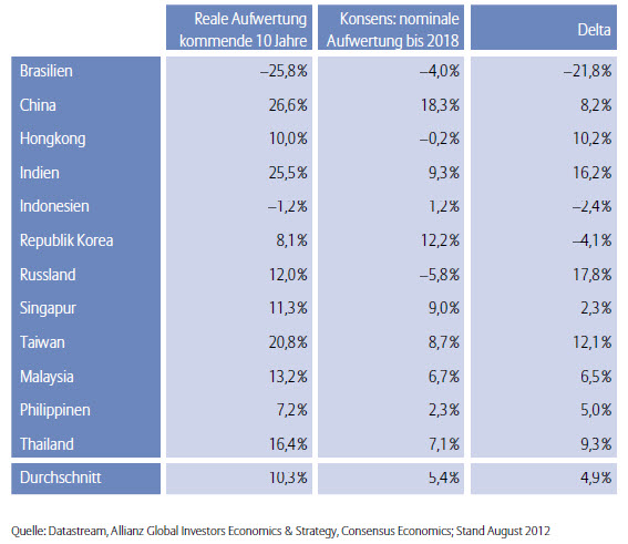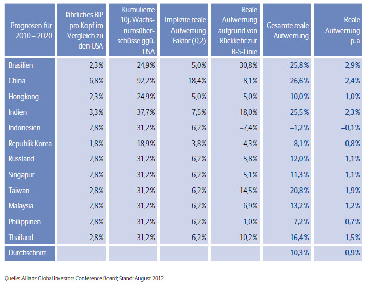 Auch das Ergebnis, dass Schwellenländer im Zeitablauf real aufwerten, werde vom Balassa-Samuelson-Effekt bestätigt: „Im Zeitablauf holen die Schwellenländer auf und die Produktivität im Sektor für handelbare Güter steigt an“, sagt Hofrichter. Die Produktivitätszuwächse seien in den Schwellenländern natürlich größer, da diese zu den Industrienationen aufschließen. „Die Löhne legen daher im Sektor für handelbare Güter stärker zu als in den Industrieländern, so dass infolgedessen auch das Lohn- und Preisniveau in den Schwellenländern insgesamt ansteigt.“ Real werteten die Schwellenländerwährungen also auf. Wie stark Hofrichter dies erwartet, ist der folgenden Tabelle zu entnehmen.