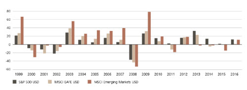 Abb. 1. Nach einigen Jahren der schwächeren Entwicklung beginnen sich die Schwellenländer zu erholen Renditen je Kalenderjahr für die Indizes S&P 500, MSCI EAFE und MSCI Emerging Markets (1999–2016)