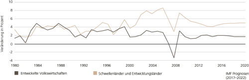 Abb. 2. Tatsächliche und erwartete prozentuale Veränderung des BIP in Industrie- und Schwellenländern
