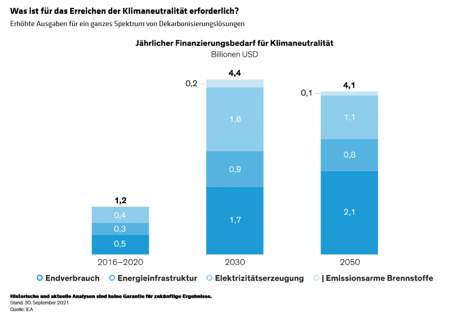 Laut der Internationalen Energieagentur (IEA) in ihrer Studie zur Klimaneutralität „Net Zero by 2050“ verfügte die Welt bereits vor der Invasion über genügend operative Öl- und Gasfelder sowie Kohleminen, um die erwartete Nachfrage auf ihrem Weg bis 2050 zu decken. Der Zuwachs bei erneuerbarer Energie und Energieeffizienz blieb jedoch trotz beeindruckender Wachstumsraten hinter dem Ziel zurück (Abbildung).