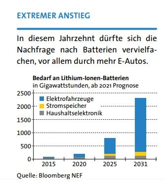 In weniger als zehn Jahren dürften etwa 90 Prozent der Lithiumnachfrage aus dem Batteriesegment stammen, schätzen Analysten. Bei Nickel geht die Entwicklung in die gleiche Richtung. Schon im vergangenen Jahr schossen deshalb die Preise der beiden Metalle nach oben. Die Sanktionen gegen Russland verschärfen die Situation nochmals, denn das Land ist ein wichtiger Lieferant dieser Rohstoffe.