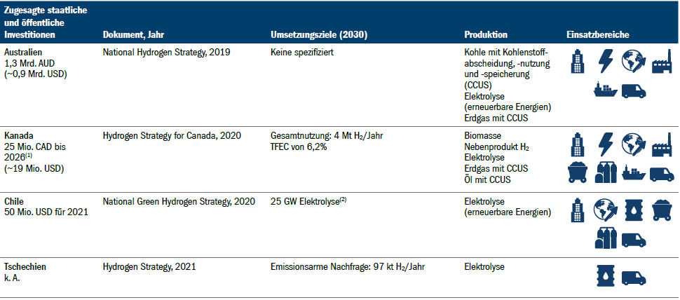 Abbildung 1: Regierungen mit nationalen Wasserstoffstrategien, angekündigten Zielen, Priorität für Wasserstoff und dessen Nutzung sowie gezielter Finanzierung