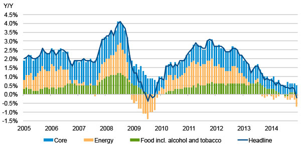 The main driver of the drop in inflation has been the sharp fall in the energy sub-index. The price of European natural gas was hit at the start of 2014 due to unusually warm weather, while the recent collapse in global oil prices has also had a big downward impact.