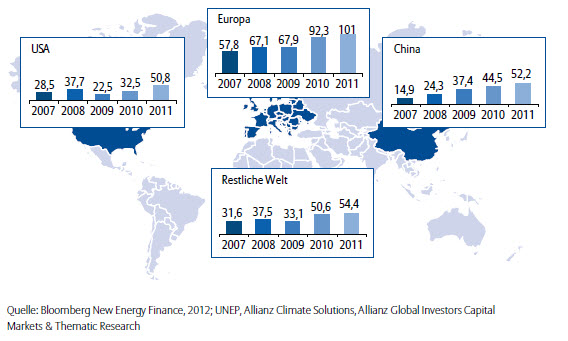 Erneuerbare Energien werden künftig eine Schlüsselrolle in der Energieversorgung spielen. Davon sind Matthias Jäger, Head Risk Advisory & Services und Matthias Brand, Senior Analyst bei Allianz Climate Solutions, dem Kompetenzzentrum der Allianz-Gruppe für erneuerbare Energien, überzeugt. Allein im Jahr 2011 seien Neuinvestitionen von über 200 Milliarden US-Dollar in Europa, den USA und China getätigt worden, schreiben sie in ihrer aktuellen Studie „Erneuerbare Energien – Investieren gegen den Klimawandel“. Zukünftig sollten auch Indien und Brasilien stärker in den Fokus der Investoren rücken.