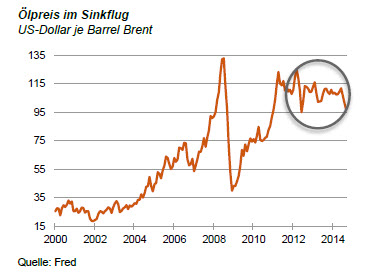 In den letzten vier Monaten hat sich der Ölpreis um 20 % verringert (von 114 auf 92 Dollar je Barrel). Das war mehr als die meisten erwartet hatten. Es ist im Wesentlichen durch niedrigere Nachfrage und höheres Angebot bedingt. Es muss noch nicht das Ende der Fahnenstange sein. Die Weltkonjunktur schaltet einen Gang herunter. Da wird auch weniger Öl gebraucht. Die Energiesparbemühungen halten an. Andererseits ist der Boom mit dem Fracking vor allem in den USA noch nicht vorbei (auch wenn sich mit sinkendem Ölpreis die skeptischen Stimmen mehren).