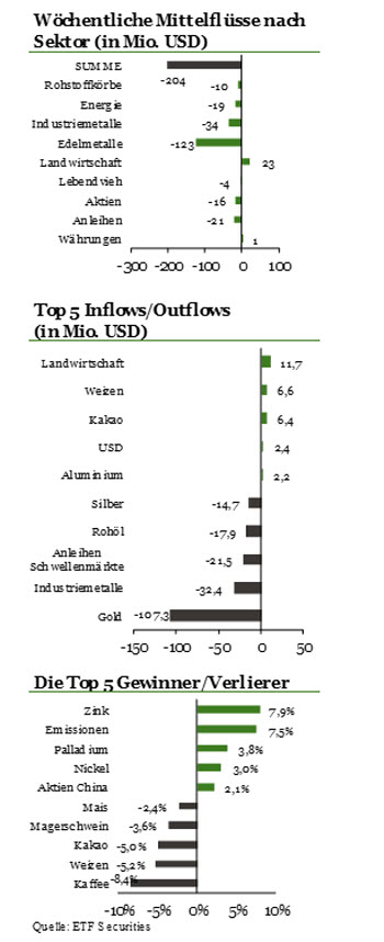 Nach vier Wochen kam es in dieser Woche bei Schwellenmarktstaatsanleihe-ETPs (A14NSR) wieder zu Abflüssen. Sie betrugen 21,5 Mio. USD, wobei sich die Zuflüsse in Schwellenmarktanleihe-ETPs seit Jahresanfang mit 63,7 Mio. USD weiterhin auf einem erhöhten Niveau befinden. „Nach den diesjährigen Gewinnen der Lokalwährungsstaatsanleihen von rund 11 Prozent nehmen Anleger Gewinne mit, da sie annehmen, dass ein Anstieg des US-Dollar für Schwellenmarktwerte problematisch sein könnte“, schließt Hein.