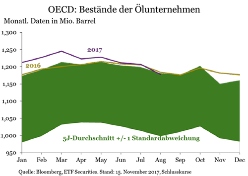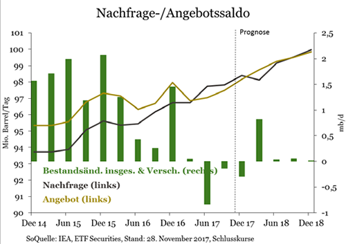 Wenn die USA ihre Produktion wie erwartet steigern und die Verlängerung der OPEC-Vereinbarung tatsächlich teilweise umgangen wird, dürfte das Angebot in der Tat zunehmen. Gleichzeitig ist es unwahrscheinlich, dass das aktuelle Nachfragewachstum unvermindert anhält, nachdem die Preise im letzten Jahr um 33 Prozent gestiegen sind. Im 4. Quartal 2017 dürfte vorerst zum letzten Mal ein Defizit verzeichnet werden. Die Überschüsse dürften in der weiteren Entwicklung einen Anstieg der OECD-Bestände zur Folge haben. So viel zum Thema Backwardation als Allheilmittel!
