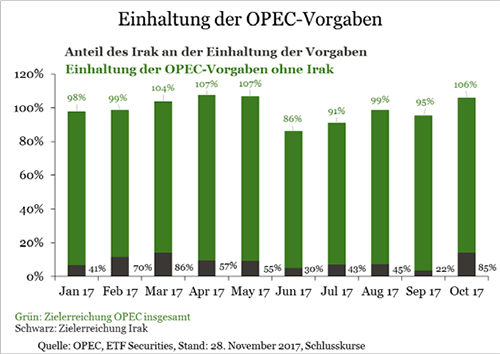 Im Oktober 2017 ließen die Zahlen der OPEC und der zehn beteiligten Nicht-OPEC-Länder die bisher beste Einhaltung der vereinbarten Vorgaben zur Drosselung der Ölproduktion erkennen. Bei genauerer Betrachtung sind es jedoch Länder wie der Irak, die ihre Werte am deutlichsten verbessern konnten. Das Land steigerte die Einhaltung seiner Vorgaben von 22 Prozent im September auf 85 Prozent im Oktober und leistete damit einen erheblichen Beitrag zur Gesamterfüllung der OPEC-Vorgaben (95 Prozent im September bzw. 106 Prozent im Oktober). Angesichts der jüngsten Unterbrechung der Produktion in den irakischen Kurdengebieten nach dem erfolgten Unabhängigkeitsvotum halten wir es für unwahrscheinlich, dass diese starken Werte erneut erreicht werden können. Wir erwarten jedoch nicht ernsthaft eine dauerhafte Unterbrechung der Ölproduktion in den Kurdengebieten. Die Türkei als wichtigster Abnehmer von Öl aus der betroffenen Region hat ihre Drohungen nicht wahr gemacht, die vorhandenen Pipelines zu schließen.