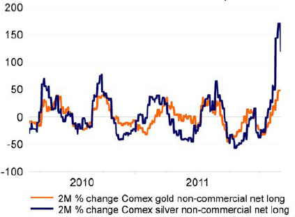 Anfang März reduzierte Straetmans' Team die Übergewichtung von Edelmetallen. Das Herunterspielen der Inflationsgefahr von Fed-Chef Bernanke habe sich direkt auf das Edelmetallsegment ausgewirkt, so der ING-Analyst. Wie der Chart unten zeigt, haben sich Netto-Long-Positionen in Silber innerhalb der ersten zwei Monate 2012 mehr als verdoppelt. Gold konnte diesem Trend nicht folgen, doch war der Zuwachs mit 50 Prozent innerhalb von zwei Monaten noch immer beachtlich. Bei den spekulativen Netto-Long-Positionen insgesamt liegt Gold über dem Niveau von Ende November 2011. „Das ist aber immer noch rund 25 Prozent unter dem Höchststand vom August 2011", so Straetmans. Bei Silber liegen die spekulativen Positionen rund 75 Prozent über dem November-Stand und damit auch noch höher als im vergangenen August.