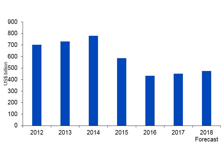 Die Preise für Brent stürzten von über 110 USD pro Barrel im Jahr 2014 auf unter 30 USD pro Barrel im Jahr 2016 ab, als die OPEC ein Programm zur Erhöhung der Produktionsmengen ausrollte. Zwischen 2014 und 2016 nahmen die Investitionen in vorgelagerte Bereiche um über 40 % ab. Die OPEC hatte sich dadurch in hohem Maße selbst geschadet und änderte aufgrund dessen ihre Strategie 2017 erneut, um die Fördermengen zu senken und einzelnen Ländern Quoten zuzuweisen. Diese Strategie erwies sich insgesamt als erfolgreich und die Preise erholten sich im Juni 2018 auf über 80 USD pro Barrel. Eine Lockerung der durch die OPEC verhängten Beschränkungen sorgte im Juni 2018 bei Öl für einen leichten Einbruch, doch die Preise haben sich ausnahmslos oberhalb des Niveaus von 70 USD pro Barrel gehalten. Im Zuge dieser Kurserholung haben auch die Investitionen in die Erschließung von Erdöl- und Erdgasquellen angezogen. 2017 stiegen die Investitionen um 4 % auf 450 Milliarden USD, für 2018 ist laut Prognosen ein Investitionsanstieg um 5 % auf 472 Milliarden USD zu erwarten. Die Branche hat jedoch keineswegs früher verlorenen Boden gutgemacht.