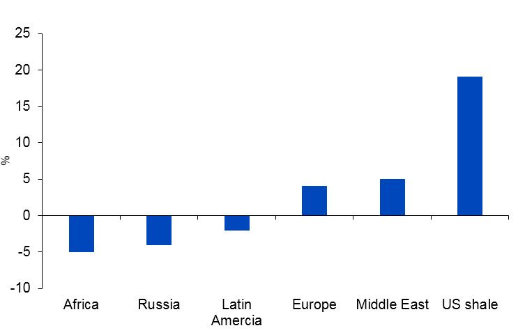 Während in Europa und dem Nahen Osten ein Anstieg der Investitionen erwartet wird, ist es wahrscheinlich, dass die stärksten Investitionszuwächse in die US-amerikanische Schieferölproduktion fließen werden, die von einer rapiden Abnahme der Fördermengen und damit kurzen Zyklen gekennzeichnet ist. Tendenziell wird bereits produzierenden Anlagen (auf Brachflächen) im Nahen Osten Priorität eingeräumt.