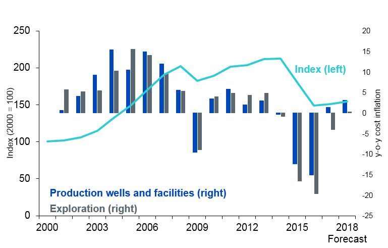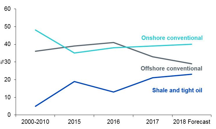 Das Gros der anziehenden Investitionstätigkeit ist auf Schiefergas und -öl zurückzuführen, bei dem kürzere Zyklen fast per Definition vorhanden sind (ca. 80 % des Outputs wird in den ersten beiden Förderjahren gewonnen). Da internationale Erdölunternehmen sich an der starken Kursvolatilität zwischen 2014 und 2016 die Finger verbrannt haben, zögern sie seitdem, sich auf langfristige Investitionsprojekte einzulassen. Das geringe Wachstum im Bereich der konventionellen Onshore-Erdölförderung ist hauptsächlich auf Investitionen in Brachflächen durch staatliche Erdölunternehmen im Nahen Osten und in Russland zurückzuführen. Die konventionelle Offshore-Förderung, die die längste Vorlaufzeit aufweist, ist rückläufig.