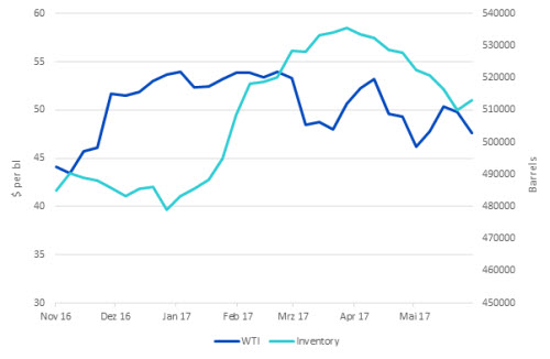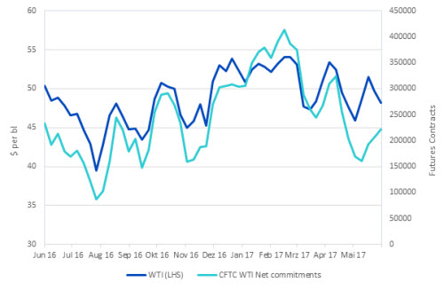 Vor dem letzten OPEC-Treffen am 25. Mai 2017 ging die Mittelbindung der Trader stark zurück und fiel fast auf denselben Tiefstand vom November 2016. Obwohl die Mittelbindung nach einer Verlängerung der Produktionsanpassungen anstieg, kam es nur zu einer moderaten Steigerung bei Long-Positionen. Stattdessen spürten die Trader die Auswirkungen anderer Faktoren, wie etwa den Anstieg der Bestände.Insgesamt wird der Ausblick für Öl auch weiterhin von einer Vielzahl an Variablen bestimmt und nicht nur von der OPEC und Drosselungen der Fördermengen. Selbst innerhalb der OPEC ist es wahrscheinlich, dass es zu Problemen im Hinblick auf die Einhaltung der Produktionsbeschränkungen kommen wird, und einige OPEC-Mitglieder, wie Libyen und Nigeria, bleiben aufgrund ihres volatileren Produktionsumfelds mögliche Swing-Faktoren. Ebenso machte sich die fortgesetzte Erholung bei Förderanlagen für Schieferöl in den USA bemerkbar. Diese hat sich zu einer zunehmend wichtigen Komponente auf der Angebotsseite entwickelt, vor allem, da jede nachhaltige Rally beim Ölpreis dazu dient, eine stärkere Beteiligung zu fördern, was zur Inbetriebnahme neuer Förderanlagen für Schieferöl führt.