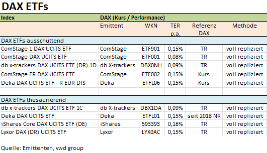 Um der seit Anfang 2018 geltenden steuerlichen Praxis nahe zu kommen, hätten ausschüttende ETFs seit Januar 2018 nun eigentlich als Basiswert einen Kursindex angeben können, der Ausschüttungen gar nicht berücksichtigt. Für thesaurierende ETFs wäre jeweils ein Net Return Index der passende Basiswert. Doch bis auf eine Ausnahme haben die Emittenten die Basiswerte ihrer DAX- und MDAX-ETFs nicht angepasst. ComStage strich einfach solche Zusätze wie TR und NR aus den Namen ihrer ETFs. Als einziger Emittent gibt die Deka mit ihrem Deka DAX UCITS ETF (ETFL01) immerhin den DAX Net Return Index als Basiswert an.