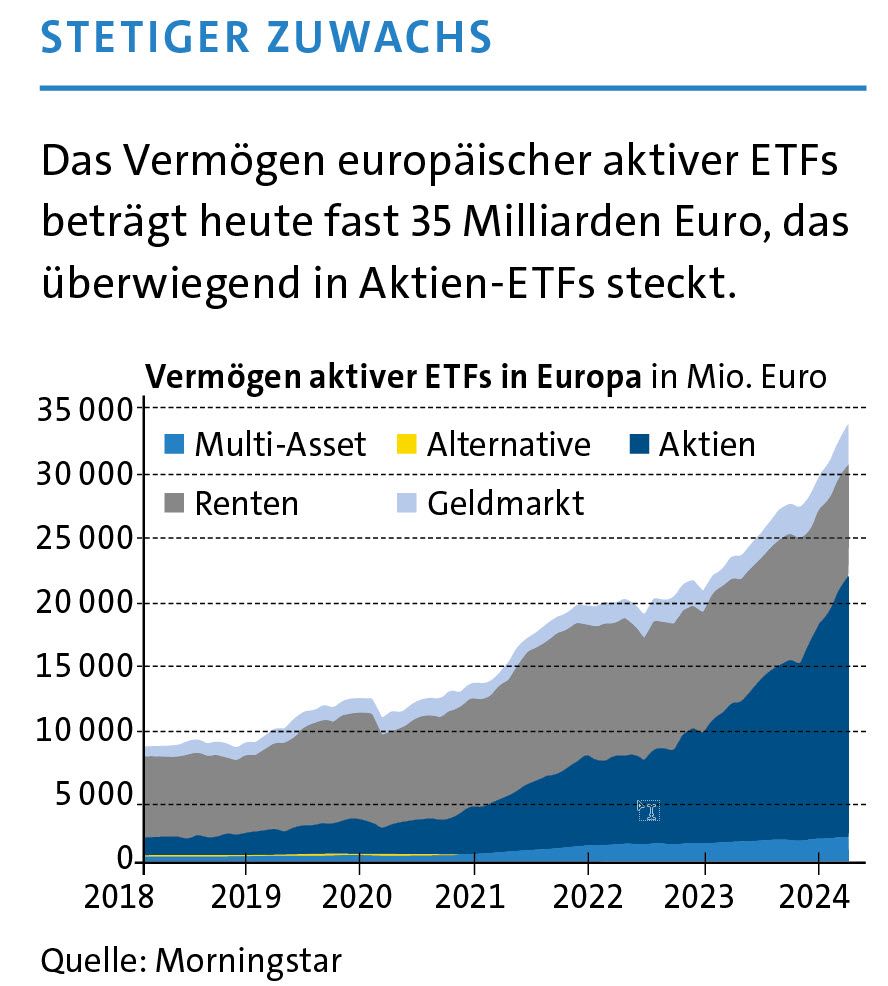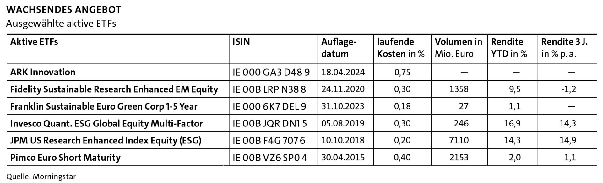 An der Deutschen Börse notieren inzwischen140 aktive ETFs. In Europa sind 18 Emittenten mit aktiven ETFs am Start, darunter auch die großen ETF-Anbieter. Dominierend in Bezug auf das verwaltete Vermögen sind jedoch einige große, auf klassische aktiv gesteuerte Fonds spezialisierte Häuser wie J. P. Morgan und Fidelity. Aktive ETFs nutzen die Vorteile der ETF-Hülle, bilden aber keinen Standardindex ab, sondern weichen bewusst davon ab. Meist geht es darum, einen Index zu schlagen, manchmal aber auch um regelmäßige Erträge oder eine besondere Kombination von Duration, Rendite und Bonität. Zunehmend fungiert die ETF-Hülle auch als preiswerter Zugang zu bewährten Strategien der Fondshäuser.