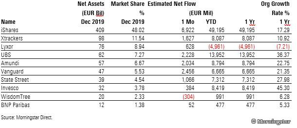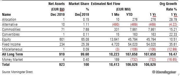 Die aktuelle Statistik der Ratingagentur Morningstar, aus der diese Zahlen hervorgehen, schlüsselt die beiden verantwortlichen Wachstumstreiber genau auf: Marktbedingt legten Vermögenswerte um gut 136 Milliarden Euro zu. Gleichzeitig flossen 107 Milliarden Euro an frischem Kapital in ETFs. Organisch wuchsen börsennotierte Indexfonds um knapp 16,5 Prozent. Zum Vergleich: Aktiv verwaltete Fonds verbuchten ein organisches Wachstum von nur 1,1 Prozent in zwölf Monaten bis November 2019.