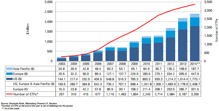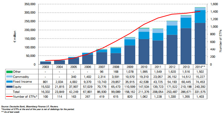 Europäische Exchange Traded Funds (ETFs) setzen ihr Wachstum fort: Der aktuellen Statistik der Deutschen Bank zufolge generierten sie in der Woche vom 14. bis 18. Juli 2014 Nettomittelzuflüsse in Höhe von 2,749 Milliarden US-Dollar (rund zwei Milliarden Euro). US-ETFs hingegen verzeichneten Abflüsse. Für beide Entwicklungen zeichnen Aktien-Indexfonds hauptsächlich verantwortlich. Seit Jahresbeginn flossen europäischen ETFs insgesamt rund 38 Milliarden US-Dollar (28,37 Milliarden Euro) zu. US-Indexfonds kommen auf 78,5 Milliarden US-Dollar.