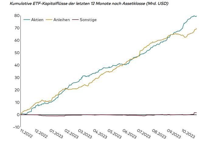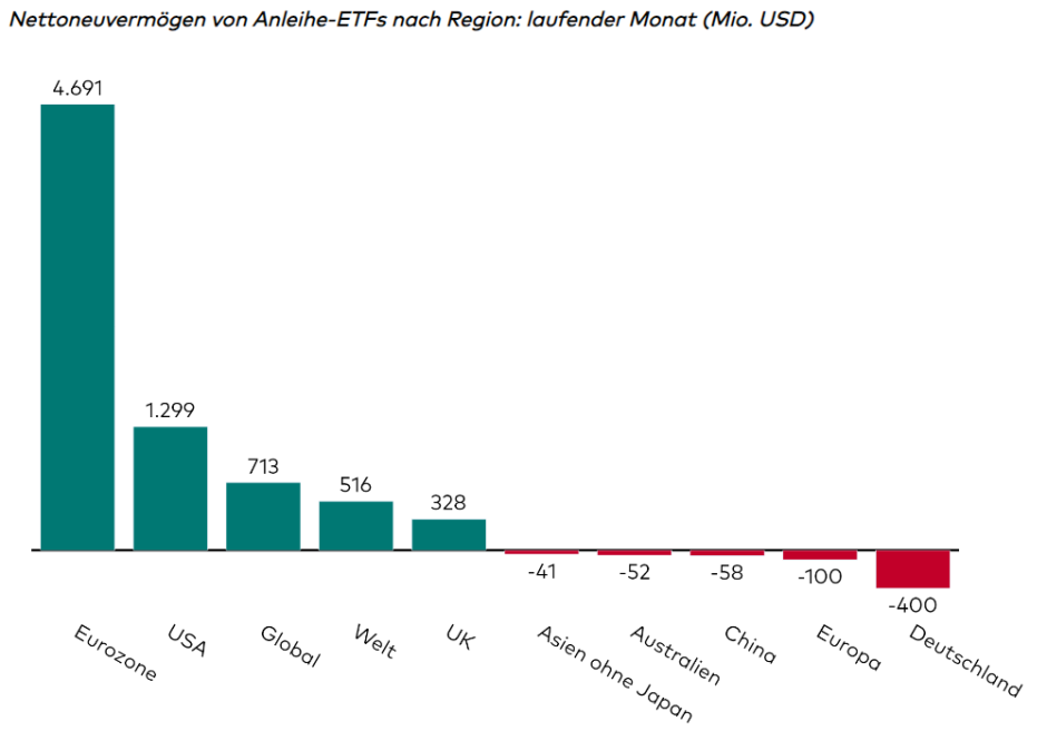 ETFs auf Anleihen aus der Eurozone konnten ihre Verluste von Oktober (-551 Mio. USD) mehr als ausgleichen und wiesen ein Nettoneuvermögen von 4,7 Mrd. USD aus. Auch ETFs auf US-Anleihen beendeten den Monat im Plus (+1,3 Mrd. USD), Strategien für Deutschland lagen dagegen zum Monatsende mit 400 Mio. USD im Minus. (pg)