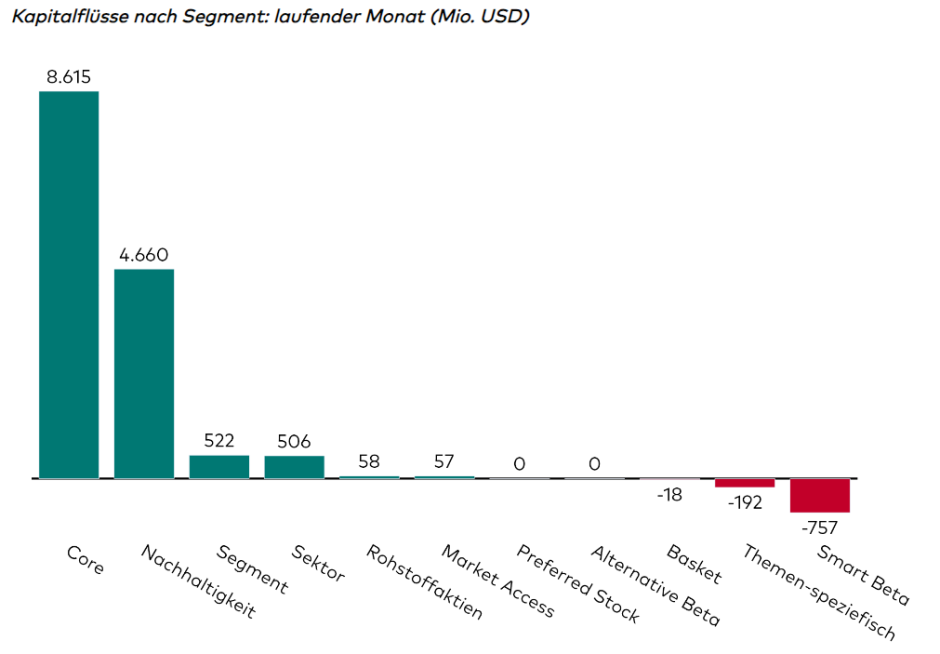 Mit Nettomittelzuflüssen in Höhe von 8,6 Mrd. USD führten Core Equity ETFs das Feld auch im November an, an zweiter Stelle folgten Nachhaltigkeitsstrategien mit einem Nettoneuvermögen von 4,7 Mrd. USD. Smart-Beta-Strategien standen dagegen unter Druck und beendeten den Monat mit Abflüssen in Höhe von 757 Mio. USD.
